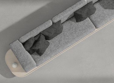 Lib is an armchair and sofa family that arranges its cushions in a staggered layout and includes a wooden side table for small items, adding a warm touch through natural wood.