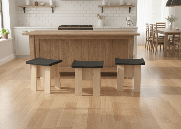 Family of stools and benches inspired by subtle Japanese curves, combining a solid wood frame with a black-stained wooden seat.